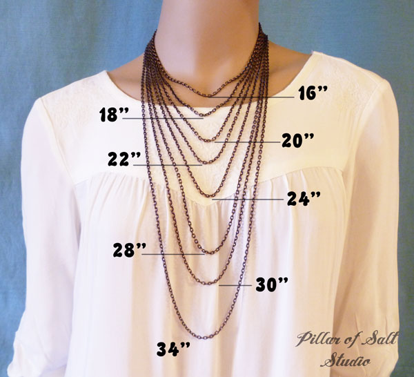 Ultimately the perfect chain length depends upon what feels comfortable and looks right to you depending upon the outfit worn with it and the pendant hanging upon itfor best results cut a long piece of ribbon and adjust the length around your neck as if it is a necklace looking in the mirror as you do so. Buying a new necklace is exciting but before rushing into any purchase it is important to factor in not only the look of the pendant but the length of the chain. To measure a necklace determine the chain length by using a ruler or tape measure.